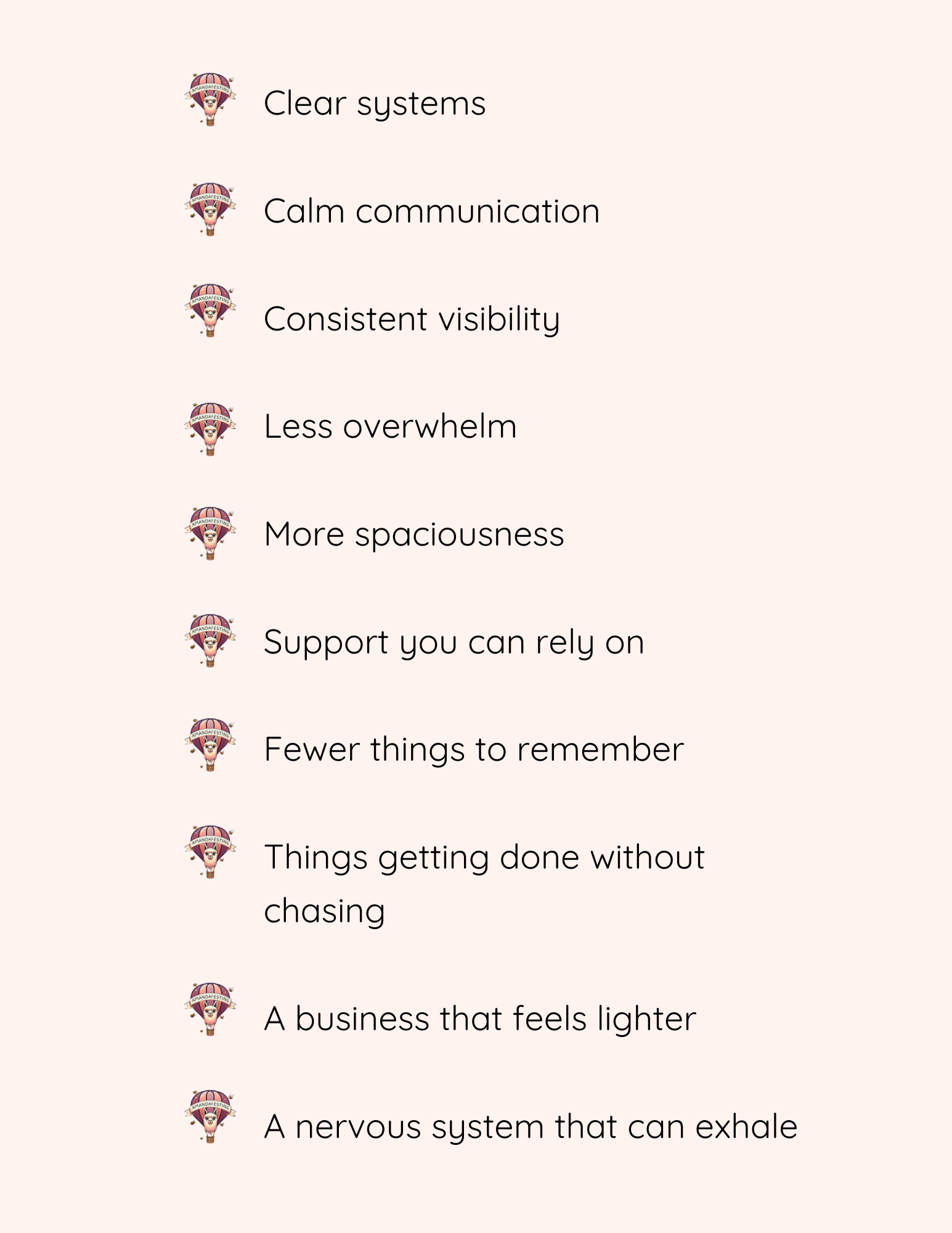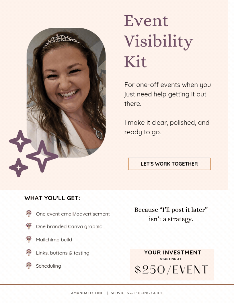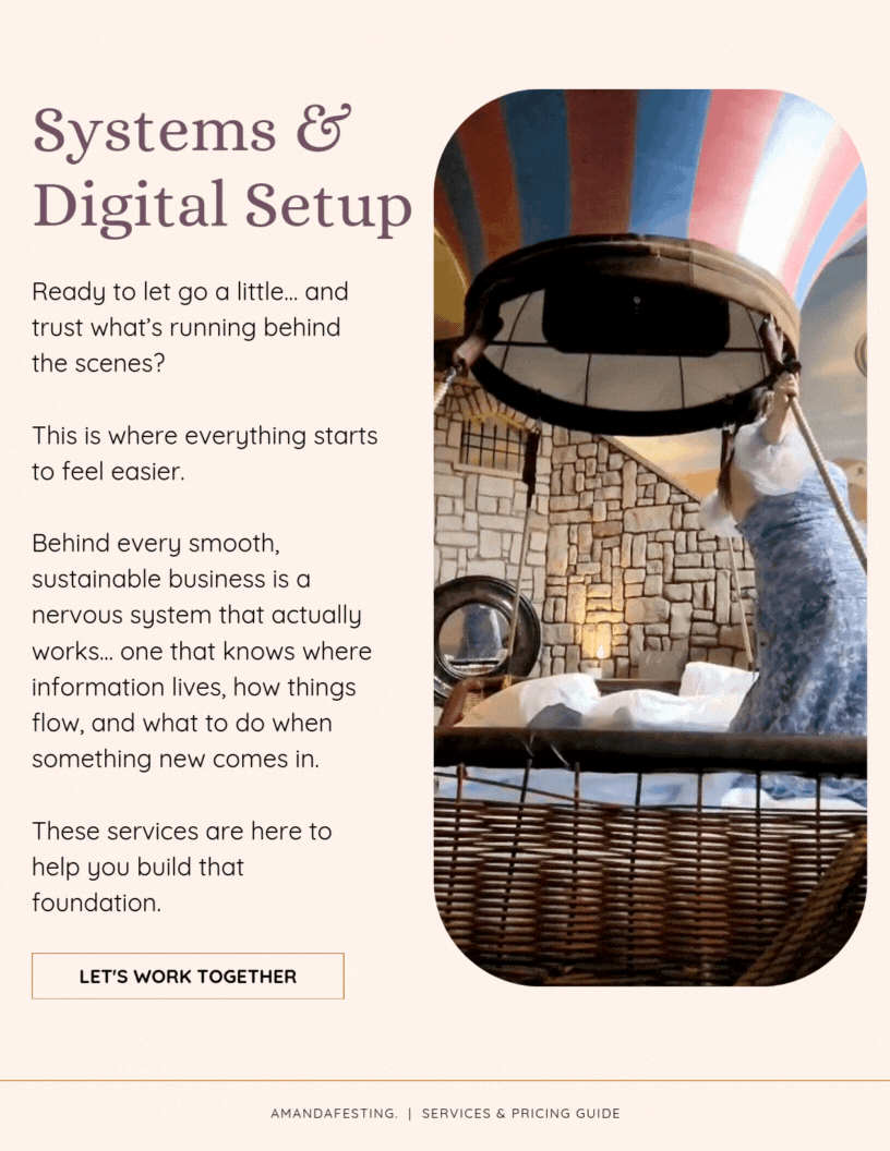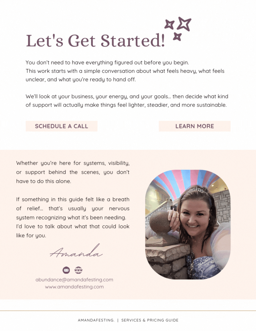 Amandafesting supports the nervous system of your business. I create simple, supportive systems… admin, workflows, email, events, and digital operations… so your business feels steady instead of overwhelmed as it grows.